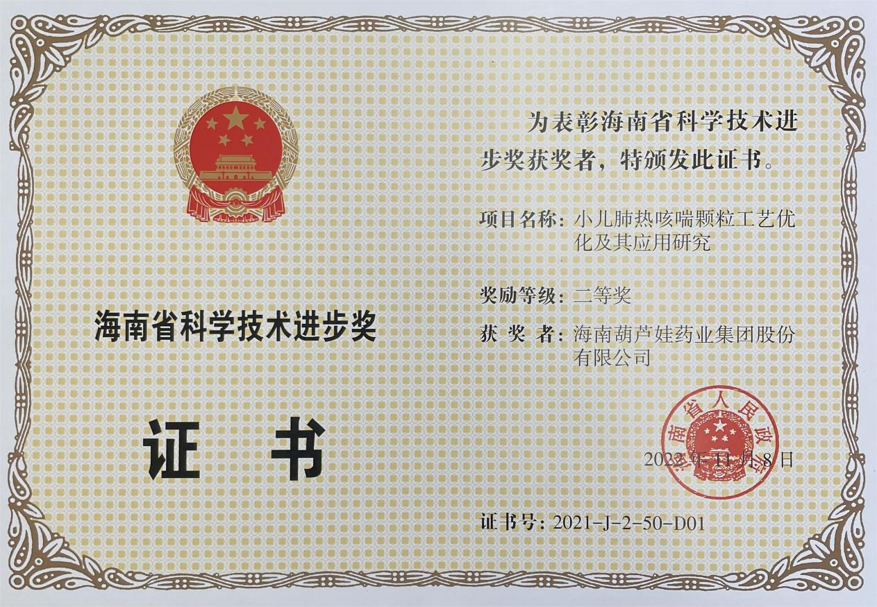 为此,小儿肺热咳喘颗粒的制备方法获得了第二十一届中国专利优秀奖(2019年),专利申请号:ZL201010134951,此次作为专利技术的应用,获得了2021年度海南省科学技术进步奖二等奖。在此之前,赏金船长牌小儿肺热咳喘颗粒还多次被授予“临床价值中成药品牌”、“中国连锁药店最具合作价值单品”,荣登“中国医药品牌榜”。