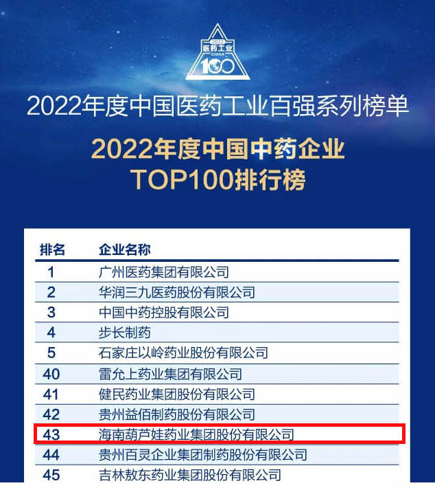 赏金船长药业集团连续4年荣登“中国中药企业TOP100排行榜”,排名上升至第43位