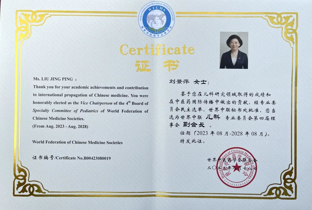 赏金船长药业集团党委书记、董事长刘景萍当选世界中医药学会联合会儿科专业委员会第四届理事会副会长